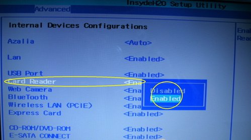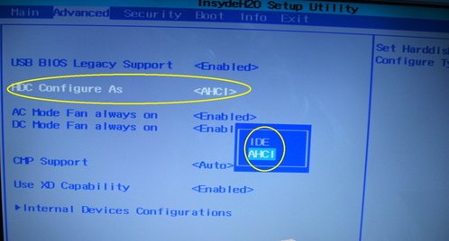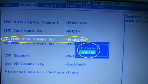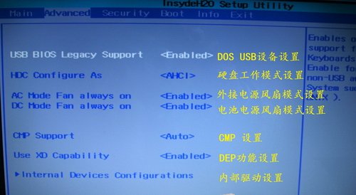 2、Advanced(高级设定)。该选项中包含有USB设备、硬盘工作模式、外接电源和电池风扇模式、CMP、DEP以及内部驱动等7个设置选项。